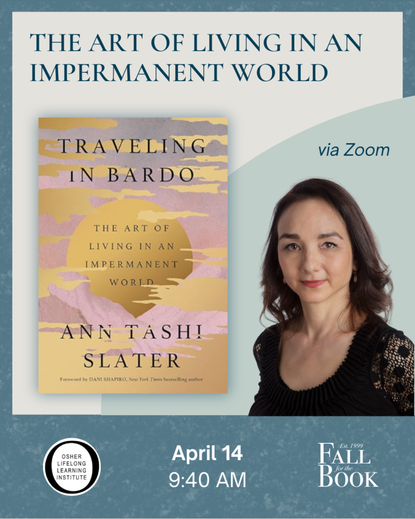 Ann Tashi Slater discusses her book Traveling in Bardo: The Art of Living in an Impermanent World, which draws on Tibetan Buddhist teachings to explore how we move through life’s inevitable transitions and losses. Using stories of family, creativity, and everyday change, Slater examines the concept of bardo—the space between endings and beginnings. Her perspective offers a way to navigate life’s shifts with clarity and purpose. Elizabeth Gilbert calls the book “Brilliant and compassionate, philosophical and practical…Both gemstone and touchstone, this book is a gift.” Presented in Partnership with OLLI Mason.