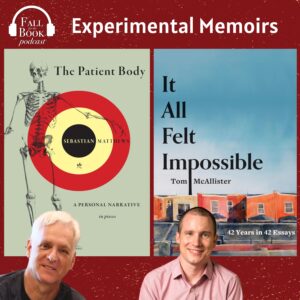 Sebastian Matthews and Tom McAllister discuss their experimental memoir structures in this episode of the Fall for the Book Podcast. In The Patient Body: A Personal Narrative in Pieces, Sebastian questions what it means to lead a balanced life as a husband, father, friend, and more through a mosaic of ‘flash’ pieces. McAllister’s It All Felt Impossible: 42 Years in 42 Essays delivers on the ambitious promise of the title. The essays, which all are 1,500 words or less, explores the profound and mundane moments that build a life.